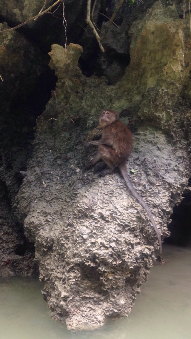 The boat left the pier at 1pm and we started with a delicious Thai lunch before heading out to our first Hong. A Hong is a cave in a limestone island (those beautiful tall islands you see in pictures of Thailand) which leads to a hollow inside, with an opening at the top. We went into three hongs – a mangrove one, one where the rocks sparkled like diamonds, and one where bat hung on the inside. I’ve got to say I was rather nervous going into the first one – the tide has to be not too high but not too low, but because it needs to be high enough for the canoe to get through, there are times when things are quite narrow or the rocks are quite low and you need to lie down. It is pitch black inside, aside from your guide’s (he paddles for you) head light, until you emerge into the centre and then it’s wow! So beautiful and serene. In the bat cave, because the tide was getting quite low, monkeys had come down to get food and one jumped on my canoe! I got such a fright that I didn’t get a picture 😦