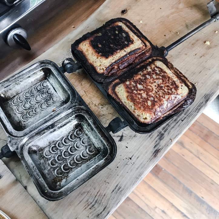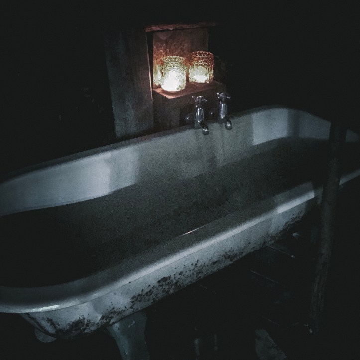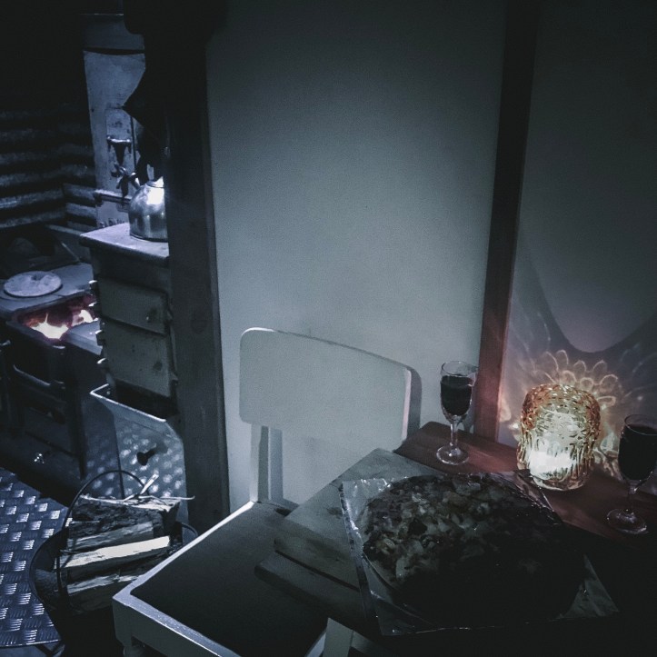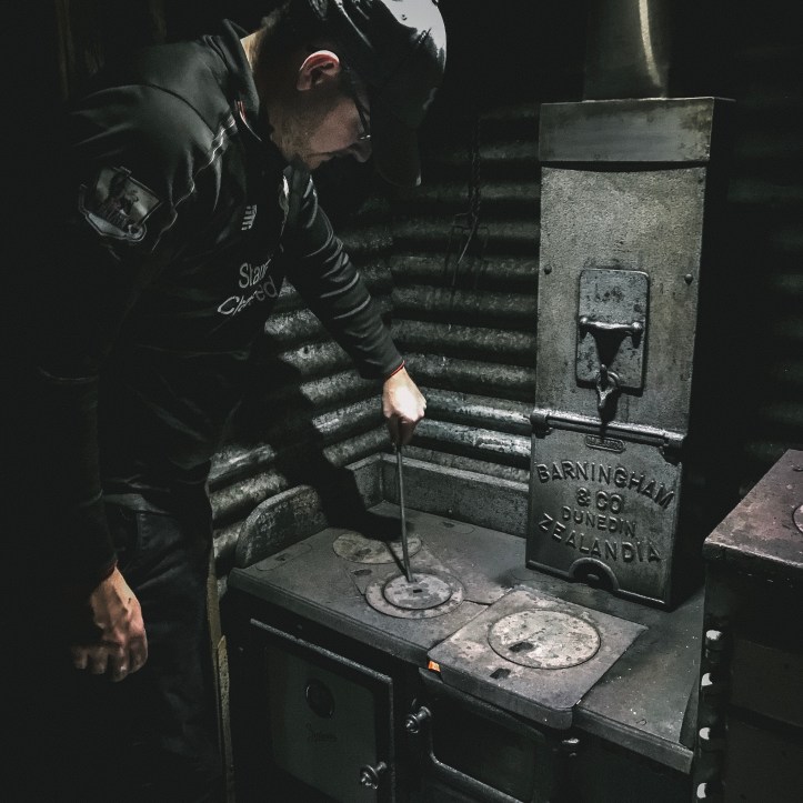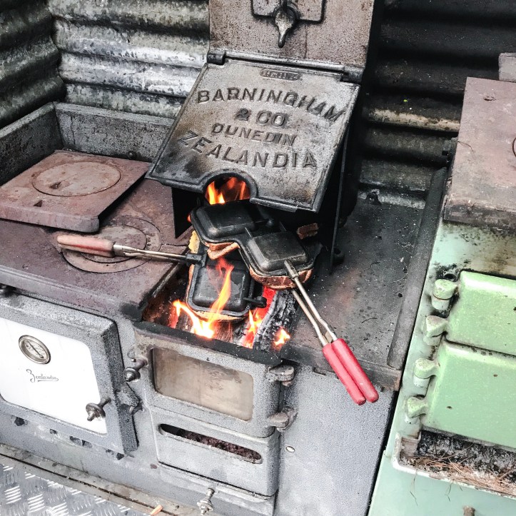 Once we got the little indoor wood chip fire going, we put the baby to bed on the mezzanine level, which would normally sleep two kids, and got to work (well, Craig got to work) getting the coal range going to a) cook our dinner, b) warm up the little lean-to kitchen area (it wasn’t a freezing weekend, but definitely not warm), and c) heat the water for the outdoor bathtub, which was one of the reasons I booked the hut. Another reason for booking the hut is that it is off the grid – there is no mobile reception, lighting is solar only, the shower runs on gas, and the toilet is a composting one (you throw a handful of sawdust on it after you’ve gone), which was surprisingly pleasant! So as Jessie slept in the cosy and warm hut, we sat around the warmth of the coal range chatting and eating our pie and potatoes Craig cooked in it, drinking red wine and listening to the sounds of nature.