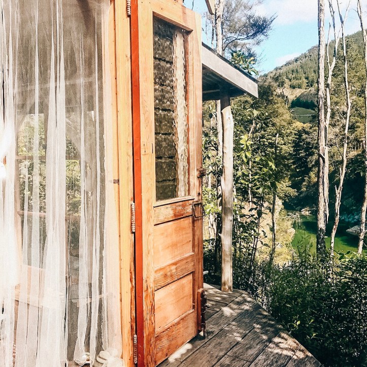 Fossickers Hut is a tiny house built on the property of Jodie and Craig, in Wakamarina Valley, looking down on the Wakamarina River. To get there you turn off the main highway and travel down a very long and quiet road, and once you think you’ve probably gone too far and missed it, you arrive at their driveway where you pass some amusing farm animals (geese and a Kunekune) on the way to your parking spot; from your parking spot you are supposed to grab the wheelbarrows provided and make your way to the tiny house as they Craig and Jodie describe in their instructions, however I somehow missed these instructions and instead we clambered over a rocky, hilly, narrow track, which included some climb-over fences, with the wheelbarrow and baby in tow. Only when we got about 3/4 of the way through did we realise that this was definitely not right, and figured out where we went wrong and that it was actually just a two minute trip on the flat… by then we had both have a very serious workout, but it made the arrival at the idyllic little house even better – it is absolutely magic. When I was a kid, I absolutely loved the Faraway Tree books by Enid Blyton – it felt to me like this is somewhere one of the pixies or fairies would live. It is quite obvious that Jodie and Craig are artistic with all the little details they have thought of, including some natural mosquito repellent available to buy in the kitchen, made by Jodie (definitely mosquito repellent is a must, by the way).