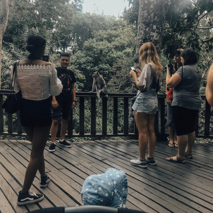 Once we arrived into Ubud, we got a sense of that solicitation you tend to get most places in South East Asia – people trying to tell us it was too far to walk to the Monkey Forest from the drop off location, but I’m glad we ignored that advice – it was perhaps 20 minutes, and sure it was super hot, but it took us down the Main Street of Ubud town – it was a bit tricky pushing Jessie’s stroller down the street trying to dodge the flow of tourists, and the scooters parked up on the side of the road, plus the footpaths are weirdly narrow, but it was great to be able to check out all the shops and warungs (restaurants) on the way through – it’s an eclectic mix of old buildings, new looking stores (perhaps just the shop fronts) selling designer looking clothing and art, people selling chopsticks for $1, beautiful cafes, gelateris, a few well known brands (Starbucks have made their mark here), markets, and lots of Buddhist offerings and incense. I would definitely like to come back one day, sans child, and explore all of them.