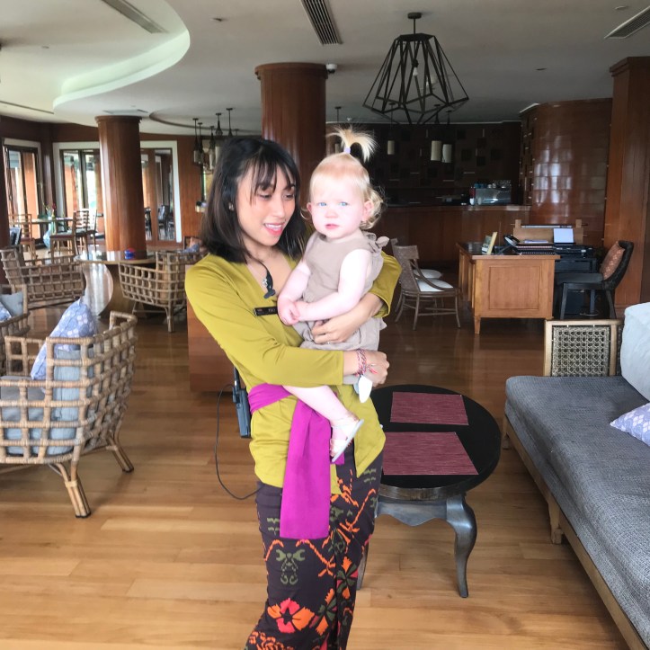 Craig and Jessie headed up to the lounge to check out, and I popped back to our room briefly, and found five of the staff standing outside (God knows how long they’d been there) with a birthday cake, as they proceeded to sing to me. It’s always so awkward isn’t it – where do you look? It was so lovely though… they were all so happy to be doing it. I took my delicious chocolate cake back up to the lounge and Craig and I enjoyed it while Jessie was whisked away by her favourite member of staff, a lovely lady called Yuli… I think Yuli was genuinely sad to see Jessie go – she walked us to the lobby (quite a way from the lounge) and helped Jessie to feed the koi while we waited for our transfer (well, except for the brief moment where she was commandeered by a couple of Chinese ladies who couldn’t speak English, but wanted a photo with Jessie).