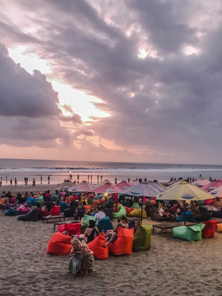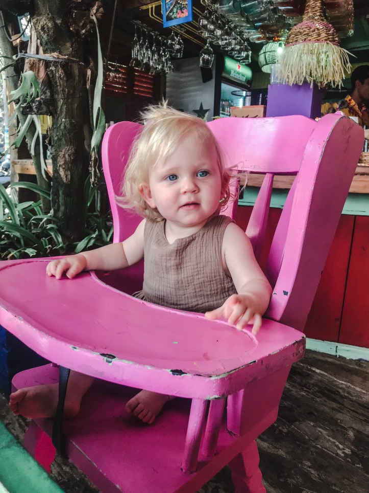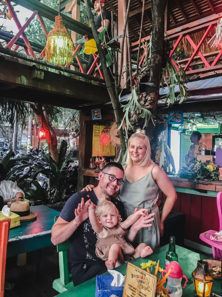 We thought we’d better head back to the villas after our shopping spree – as I said, there wasn’t much else to look at and it was getting on for 2.00pm, so we thought we might still be able to squeeze in a nap before leaving for our dinner. I had planned dinner to be at 5.30pm in hope of securing one of the colourful beanbags and umbrellas situated on the sand in front of La Plancha, but unfortunately they seem to be extremely popular and are on a first in first served basis – even though we arrived a half hour before our booking, they were already all taken, and so we headed to the table reserved for us on the ground floor of the two storey building. The music was pumping, and there were lots of people streaming in and out, so I can imagine it is a spot that really goes off later in the evening. Jessie was given a high chair fit for a royal baby, which she didn’t seem to appreciate as much as I did, and we had a lovely share plate style dinner. I’d definitely recommend La Plancha, but I would say aim to be there maybe around 3.30pm, so that you can nab those beanbags and watch the sunset. Inside is nice enough, but it feels like you’re being ripped off when you can see how good the beach looks. There are also a lot of flies inside, which I struggle with a lot. Something that makes me laugh about Balinese restaurants, and accommodation for that matter, is that the staff talk to each other on radios, and so it feels to me like I’m in Gillead – you won’t understand that if you don’t watch The Handmaid’s Tale, but if you don’t watch it you don’t deserve to get the joke 😉 – highly amusing.