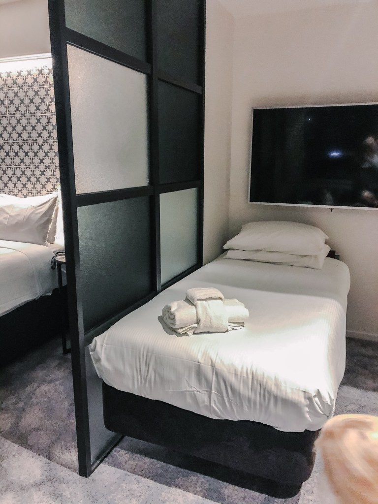 We’re staying at the Airedale Suites tonight – part of the Scenic Hotel Group, it’s one is their more luxury brands, and it’s really lovely – a very spacious room with two large TVs – one in front of our bed, and one opposite the sitting area, which is where the hotel have kindly put a very decent rollaway bed for Jessie, and it’s even behind a divider, so it’s like her own wee room. The views are great – our room looks right out to the Sky Tower. We’re staying tonight, checking out tomorrow and heading elsewhere for two nights, and then we’ll be coming back here for our final night.