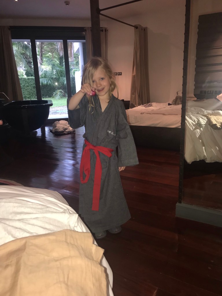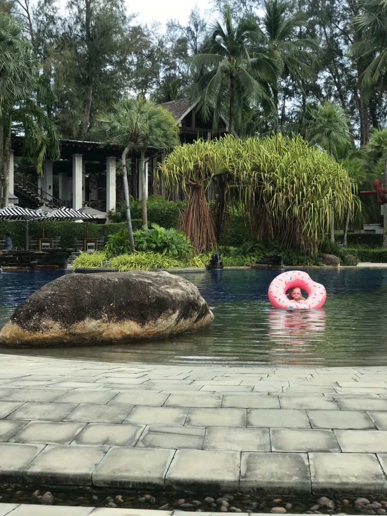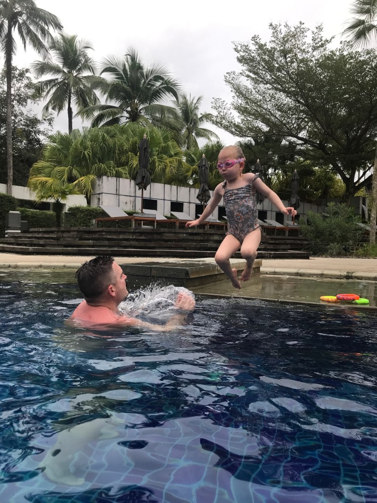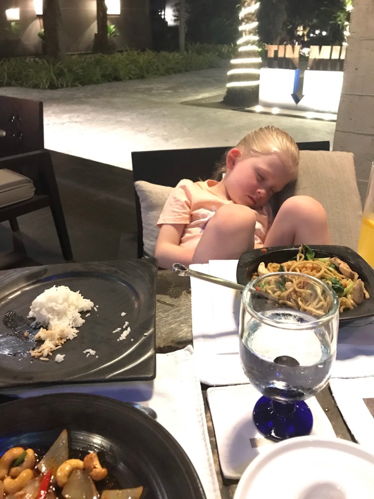 After such a massive day following on from travel day, Jessie was absolutely knackered and fell asleep in her seat at dinner (but not before she got to see a frog doing a wee, which was followed up with many many questions) before she even got to eat it (which the staff all found adorable and put extra cushions around her and a napkin over her as a blanket) – we carried her back to our room after we’d finished ours and she didn’t even wake when I put her in bed.
