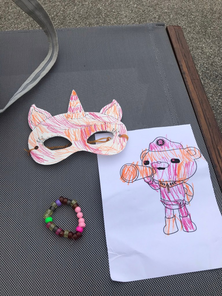 After brekkie Jessie wanted to go straight to the pool, so we were there first ones there at 8am and took with us her new robo fish that Craig had bought her (it swims in water) and she had maybe four hours of fun playing with that… I had a beaded necklace break so probably spent a quarter of that time threading tiny beads back together.