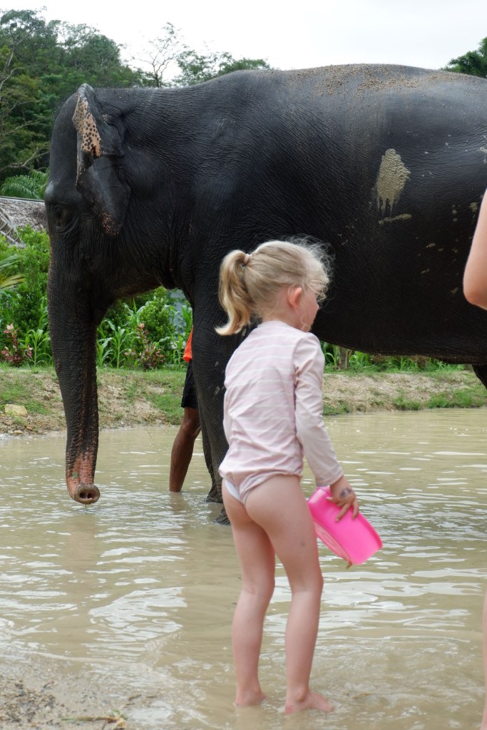 There are two large pools on-site, a mud pool, and a clean pool – first the elephants got into the mud pool and sat themselves down, and then we got in with them with some plates to scoop mud into, and once we had some good mud ready we rubbed it all over them – my girl looked to be in utter bliss, closing her eyes when we rubbed the mud onto her trunk and face. Jessie wasn’t too sure about this part, but she enjoyed watching.