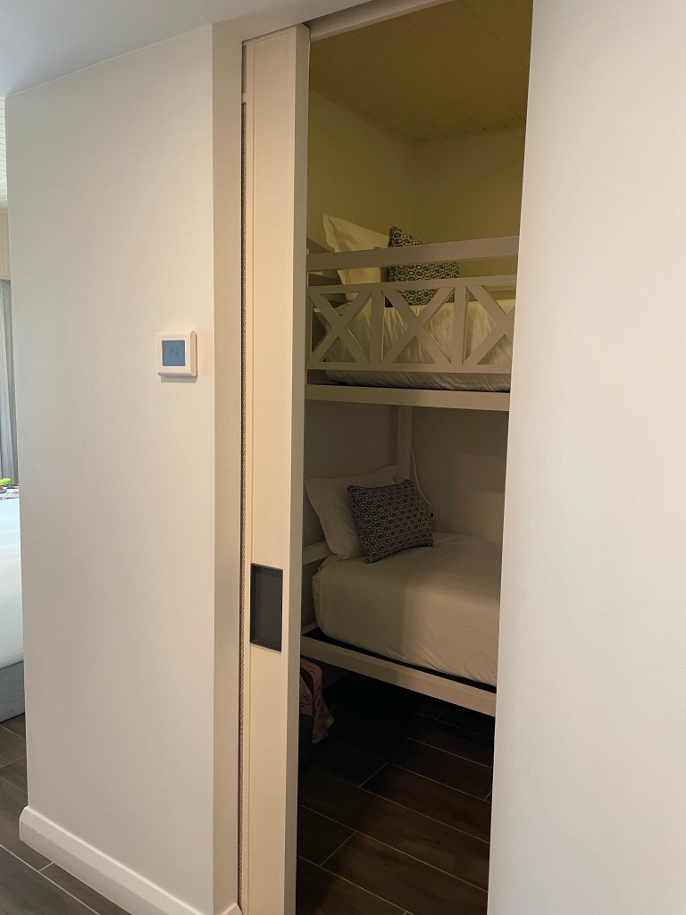 The family rooms are very well appointed, if you are a family of four or less (I think if you have more than that you’d have to go with ordinary interconnecting rooms), and have a little nook with a set of single bunk beds.