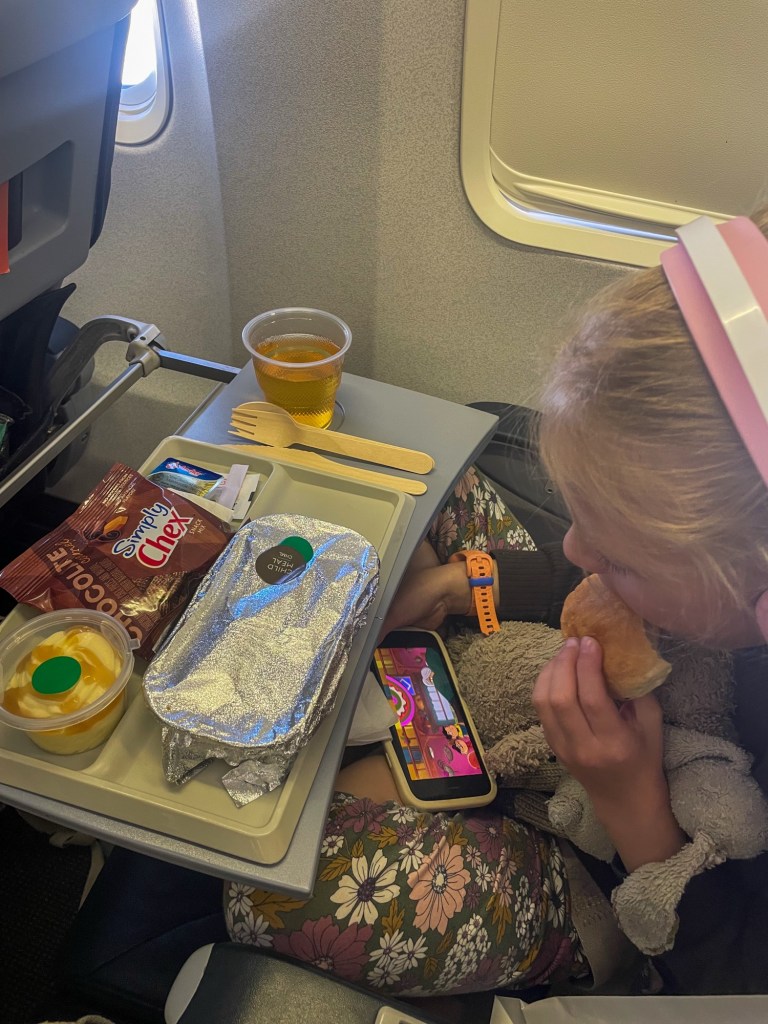 Jessie got her kids’ meal, and they’re always quick to get these out, which is great, as we all know how impatient kids can be when it comes to meals. She was pretty happy with her bun, chicken Alfredo pasta, caramel dessert, and packet of Chex (I think Craig and I were more excited for the Chex than she was… I haven’t seen those things in ages! So good!). She said to me, “I love airplane food, mummy.” Me too, Jessie… It’s like a cozy little TV dinner, like you see in American movies. You’ve got your tray, all the little bits and pieces you need, entertainment in front of you (maybe), and best of all, you didn’t have to cook it!