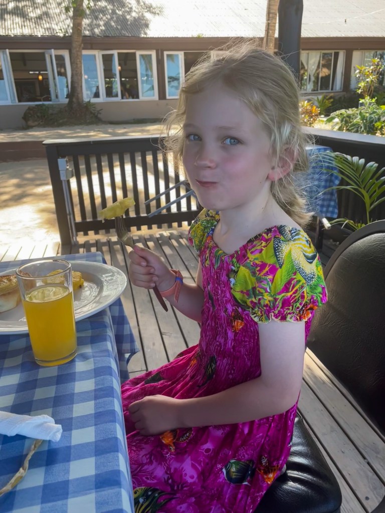 The girls woke at 7 a.m. New Zealand time, which wasn’t too bad given the light, birds, and excitement, and were ready to start the day. I felt quite ready myself… Isn’t it funny how at home, I could happily sleep in until 9:30 or so, but on holiday (especially in a warm country), I’m ready to go at 7, no worries. Craig got up and went for a run, the girls headed outside to look at the beach and have a little paddle, and when Craig got back, I went up onto the deck and did a little Pilates session. I know that sounds idyllic, but I actually got bitten to bits by the mosquitoes, so tomorrow I’ll need to douse myself in repellent before heading out.