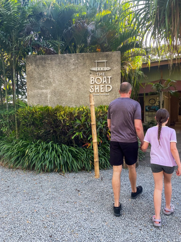 After a day of relaxing, the girls learning to use their snorkels and flippers, a bit of knitting, a game of TACO CAT, and a coconut being husked and (very slowly) gnawed at, along with a few Fiji Bitters, we headed down to Vuda Marina for dinner. What a super cool wee spot! It has a covered bar/restaurant overlooking the marina, plenty of outdoor seating (which we opted for), a kids’ play area (although Jessie was more focused on finding pretty frangipani flowers to wear on her ear), and a band playing. The food was great, the two buckets of Fiji Bitters were great… highly recommend to anyone staying on the mainland.