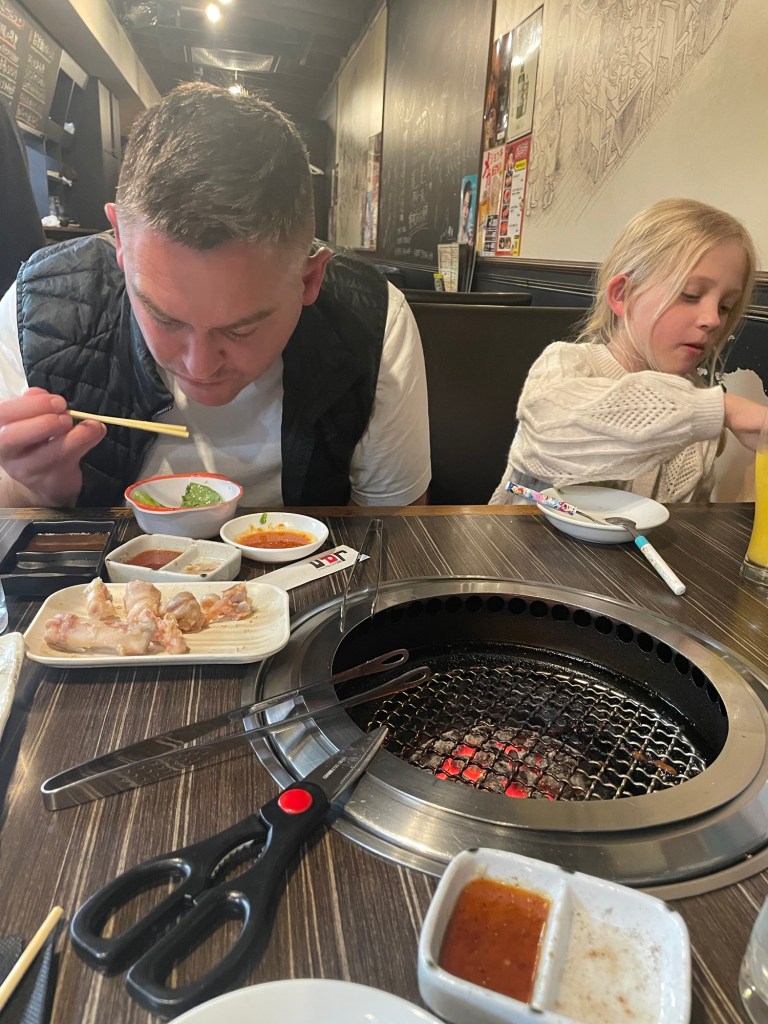 Craig chose a yakiniku spot called Jan for dinner, and Jan himself was a total character—no English, but lots of expressive energy. When we tried to BBQ already-cooked pork knuckle, he practically leapt across the table to stop us, pointing dramatically to the dipping sauces and declaring them “oishī!” (delicious). He wasn’t wrong. Jessie ordered more pork and basically drank the sauce.