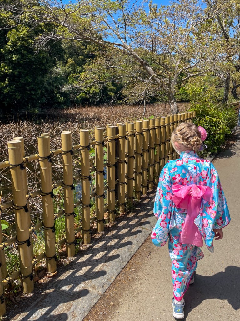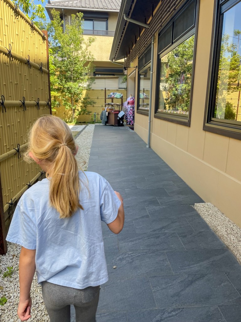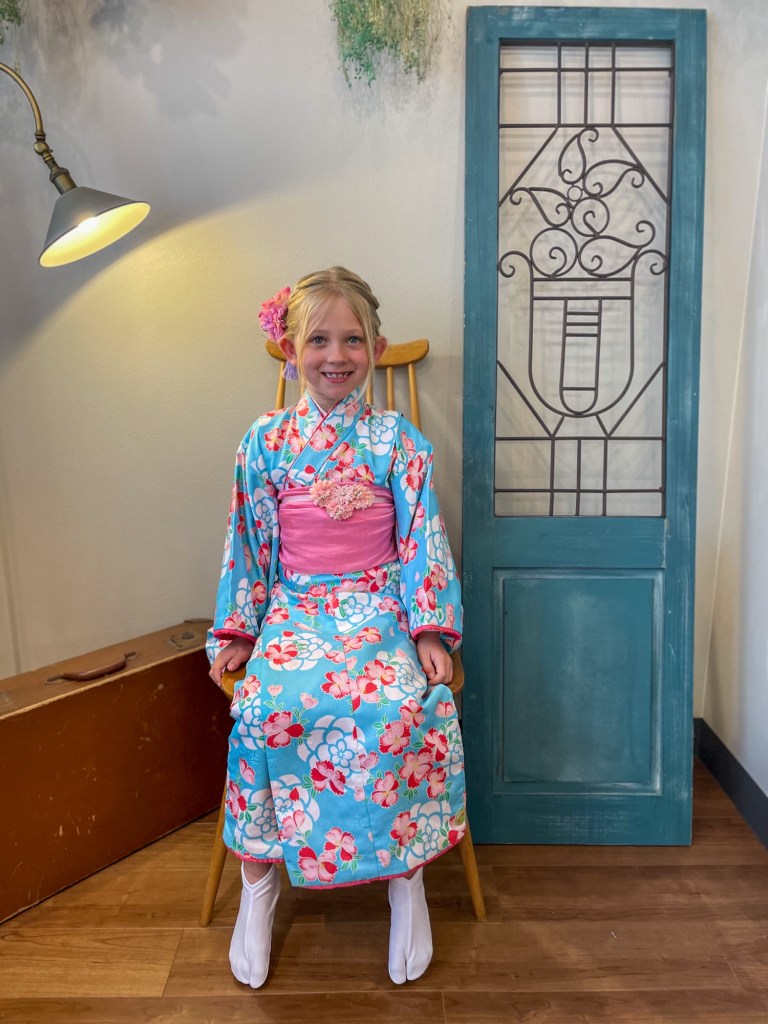 At 11am we returned to the kimono store and the excitement began. Jessie chose her kimono and hairstyle, and while Craig waited outside, we were ushered upstairs. The hair styling station was a joy – Jessie was absolutely gleeful, and the little girl next to her looked just as thrilled. Once her hair was done, it was time to dress. While not quite as complex as an adult kimono fitting, it was still an impressive process. She eventually came down the stairs very slowly in the traditional Japanese shoes (which, as predicted, didn’t last long), and looked utterly adorable. The store took a few photos for their website, we got to snap a few as well, and then we were ready to head out for the day – our very own mini maiko in tow.