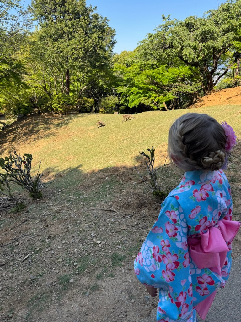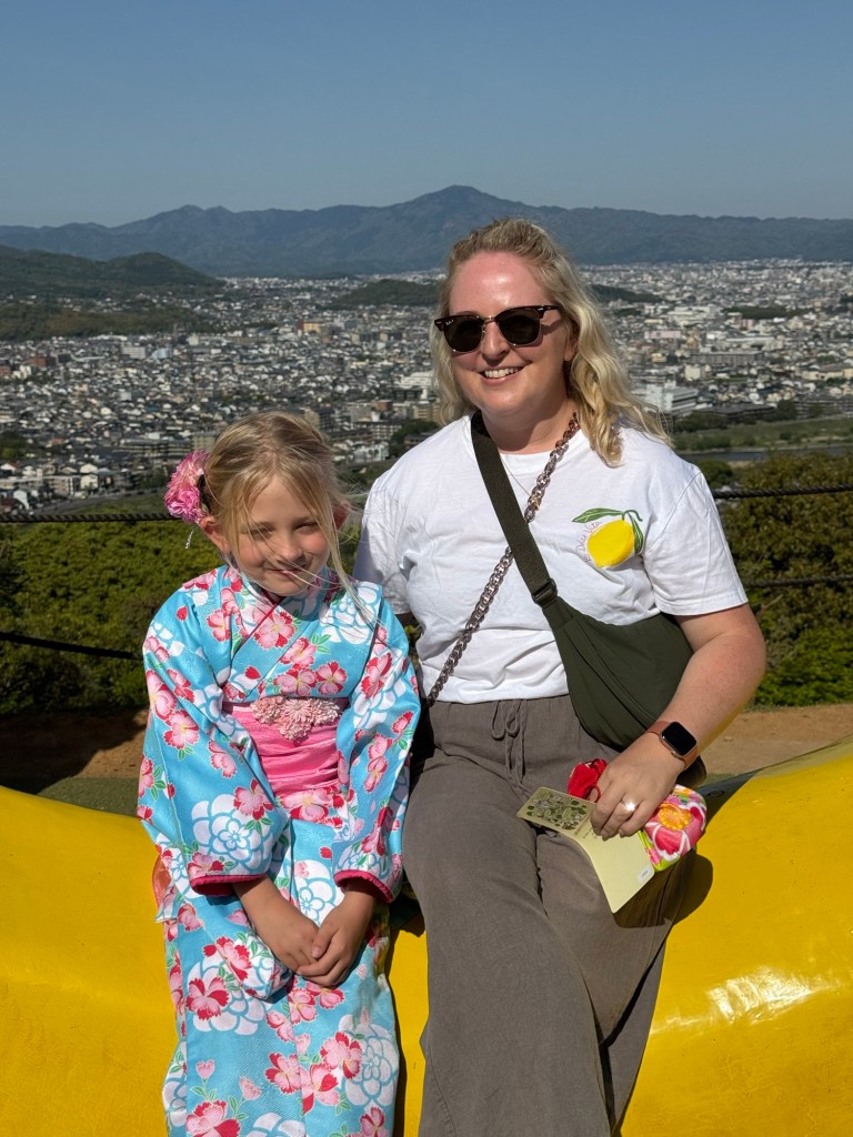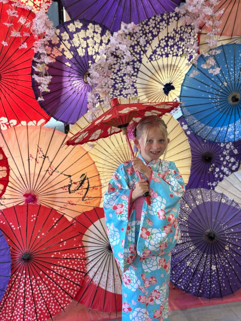 Our first mission was to find the kimono rental store, which was tucked down a quieter street (thankfully!). We made Jessie an appointment for 11am, and with half an hour to spare, we went off to explore and grab some treats. The main street was bustling but fun – full of interesting shops, restaurants, and plenty of people-watching opportunities. Jessie ordered her ice cream in Japanese, which delighted the vendor, who then complimented my lemon-print t-shirt, calling it “kawaii” (cute). Thanks to my 70-day Duolingo streak before arriving, I knew what she meant and was able to reply – it was a lovely little interaction, and a reminder that even a small amount of language goes a long way here.