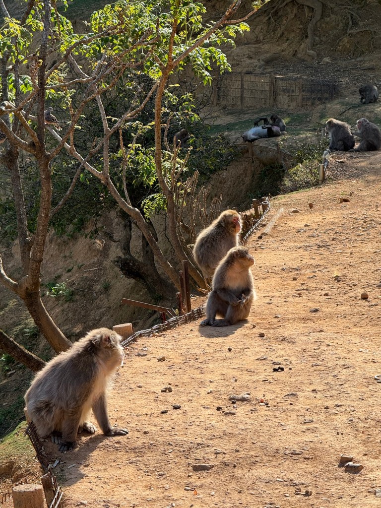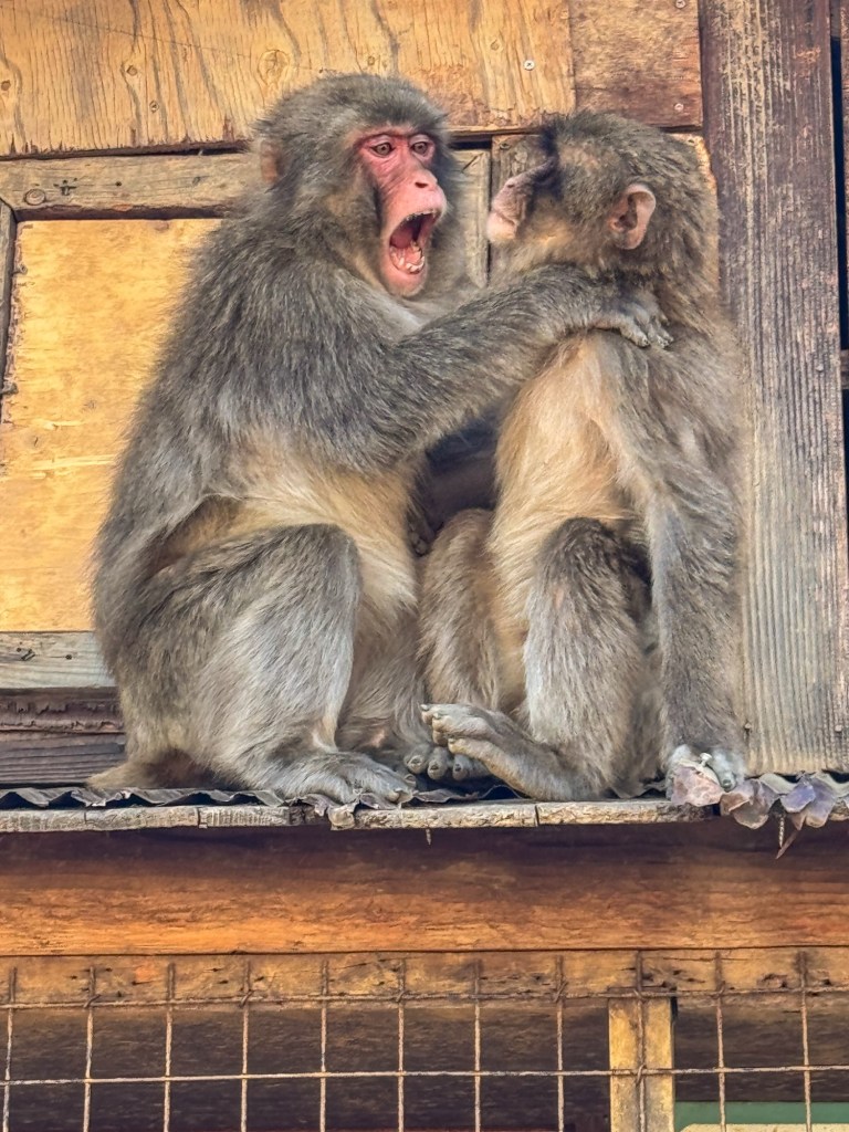 From there, after realising Craig left his hat at restaurant and he went back to retrieve it, it was on to the Iwatayama Monkey Park! We crossed the scenic river and made it just in time for last admissions. The climb to the top was steep (again, not an ideal summer activity), but so worth it. The monkeys were adorable – small, fluffy, with red faces, and refreshingly chill. Unlike other places I’ve been (Bali, Cambodia, Malaysia…), these monkeys weren’t aggressive at all. They mostly ignored us unless you were in the feeding “rest house,” where you could hand them bits of apple or peanuts. We took in the view of Kyoto, posed with the giant banana statue, and soaked in the peaceful energy before beginning our descent.