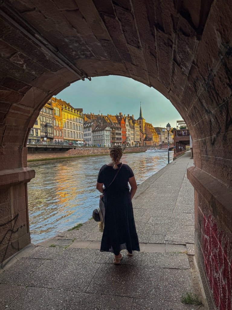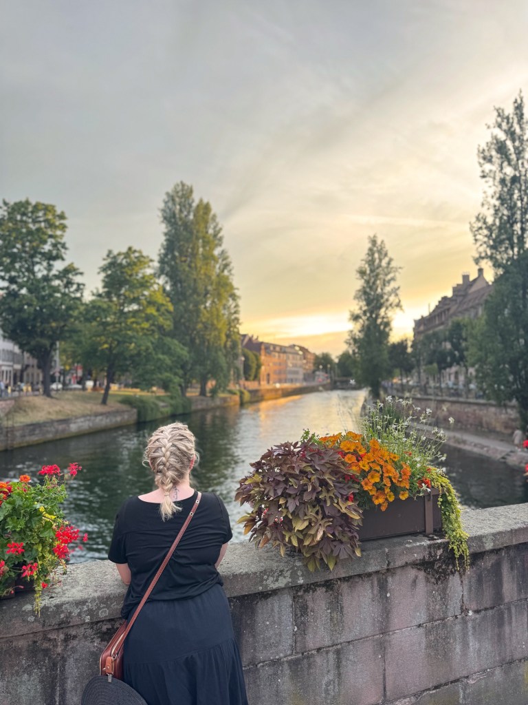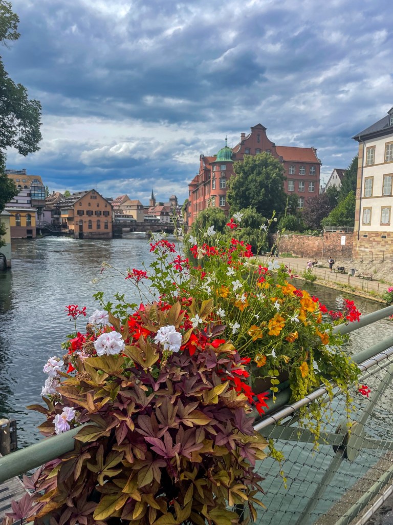 The 20-minute walk to our hotel was hot, and tough for Craig who was carrying and dragging bags along the cobbled streets. But it wasn’t long before we were in the heart of Strasbourg, surrounded by iconic half-timbered houses, colourful flowers on the bridges (ponts), and the sparkling river. Total fairytale stuff.