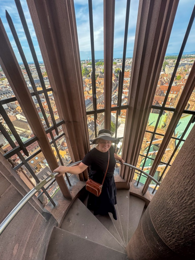 After dropping our bags, we headed out to explore. We visited Strasbourg’s Notre Dame Cathedral, where we climbed hundreds of stairs up a tight, spiralling staircase to the old guardhouse and viewing platform. It was a heart-pounder – I had to stop a few times and it was dizzying going around and around – but the panoramic view was worth every step.