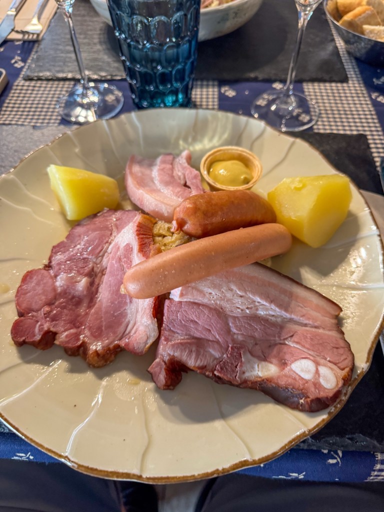 Craig and our Austrian friend both ordered choucroute (the Alsatian version of sauerkraut with meat), and I ordered a sausage salad – which turned out to be finely sliced sausage (you could twirl it like pasta!) with cheese… and it was cold. Not quite what I expected, and there was a lot of cheese.
